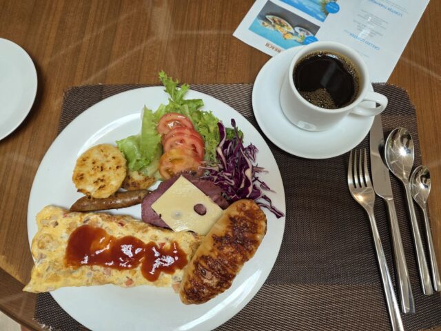1時間ほどサクッと楽しんでシャワーを浴びて朝食へ。